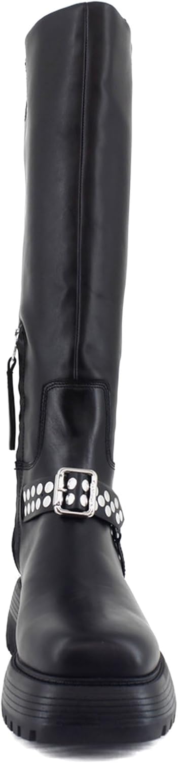 Embrace your inner rebel with the Hayes moto boots! Featuring a studded harness detail and chunky soles, these boots are perfect for channeling your bad girl vibes.