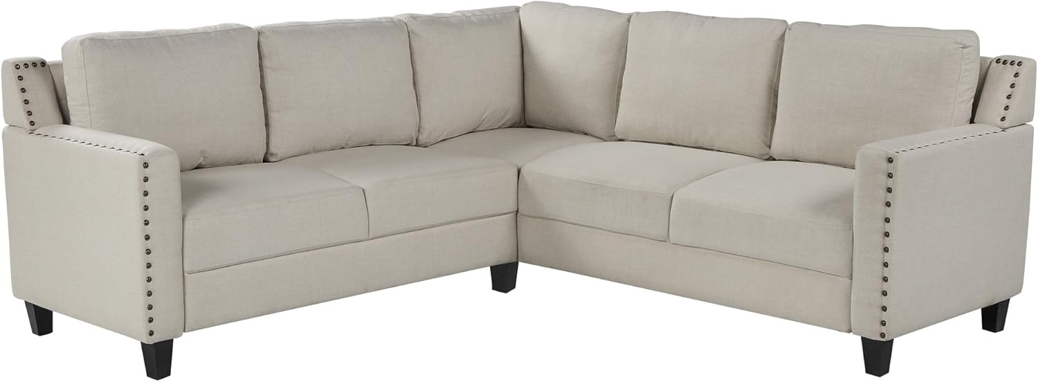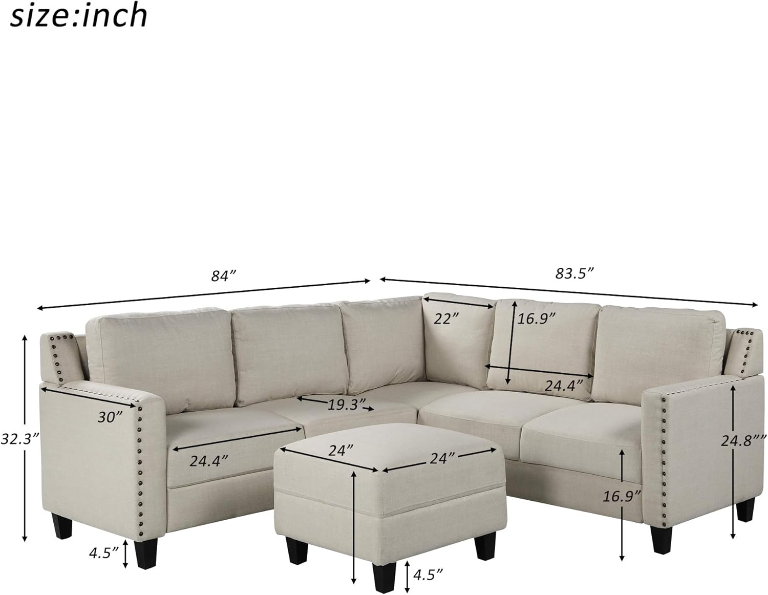 Timeless simplicity and classic appeal define this L-shape sofa set, designed to add effortless charm to your home and help tie your living room together. Spacious in build, the sofa is crafted in a traditional L-Shape designed for high seating capacity while conserving valuable space in your home in style. Upholstered in thick linen-like fabric, this sofa set is available in a pebble gray or neutral beige tone that will compliment your space beautifully. Plush cushions and deep seating with a matching ottoman offer enhanced comfort while accent nail head trim runs along the armrests for a polished finishing touch. A classic staple with a high-demand style, this set is built for quality and is priced competitively. Weights & Dimensions Sofa:84"x83.5"x32.3" Ottoman:19"x24"x24" Sofa arm height:24.8" Seat Cushion Thickness:7.8" Overall Product Weight:255 lb. Specifications Product Type:Large Sectional Design:Stationary Stationary Pieces Included:1 Ottoman and 1 Sectional Number of Pieces:2 Upholstery Material:Microfiber/Microsuede Seat Fill Material:Foam Back Fill Material:Foam Frame:Material Solid + Manufactured Wood Leg Material:Plastic Leg Color:Black Seat Construction:Foam Seating Capacity:5 Back Type:Cushion back Removable Cushions:Yes Removable Cushion Cover:Yes Reversible Cushions:No Product Care:Spot clean with a damp cloth and soluble soap Weight Capacity:250 lbs/seat Notes: There will be chromatic aberration caused by light difference, thanks for your understanding.
