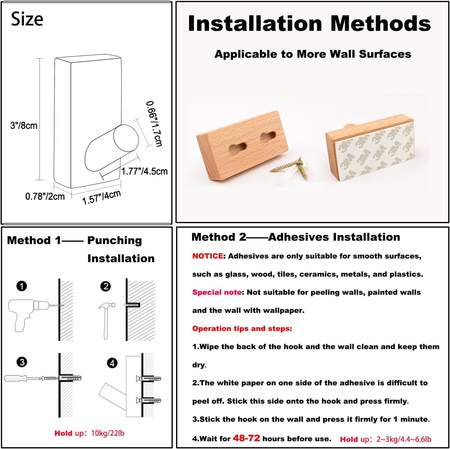 SPECIFICATIONS: ✓【METERIAL】: Beech wood come from Germany. Black walnut wood. ✓【ACCESSORIES】: Installation accessories, Adhesive,detailed installation instructions included. FEATURES MORE: ✓【EXCELLENT DESIGN】: Wonderful design, artistic and simple life. Rounded corners do no harm to objects. Perfect for variety of clothes, umbrellas, bags. ✓【DIY STYLE & WIDELY USED】: Various objects can be hung by combining different numbers and locations of hooks. DIY combines to create a very personalized and beautiful style. That's amazing beyond Description. WHY CHOOSE US: ✓【HIGH QUALITY】: Everyone was strictly checked to ensure that each is the better. ✓【BETTER WOOD】: Better wood better hooks. We choose FAS grade wood which is the better wood, not the cheaper one. Advanced product quality and excellent user experience are our first pursuit. ✓【AFTER SALES GUARANTEE】: Please contact us if you have any problems during installation, we will try our best to help you solve them. We offer a 30 days after sales guarantee if you don't satisfied with our products. DESIGNER TEAM ✓We are committed to providing various style hooks, professional, useful and beautiful. ✓We attach great importance to design and quality details. A better hook can save you a lot of trouble. Search ''HomeDo'' to get more choices.
