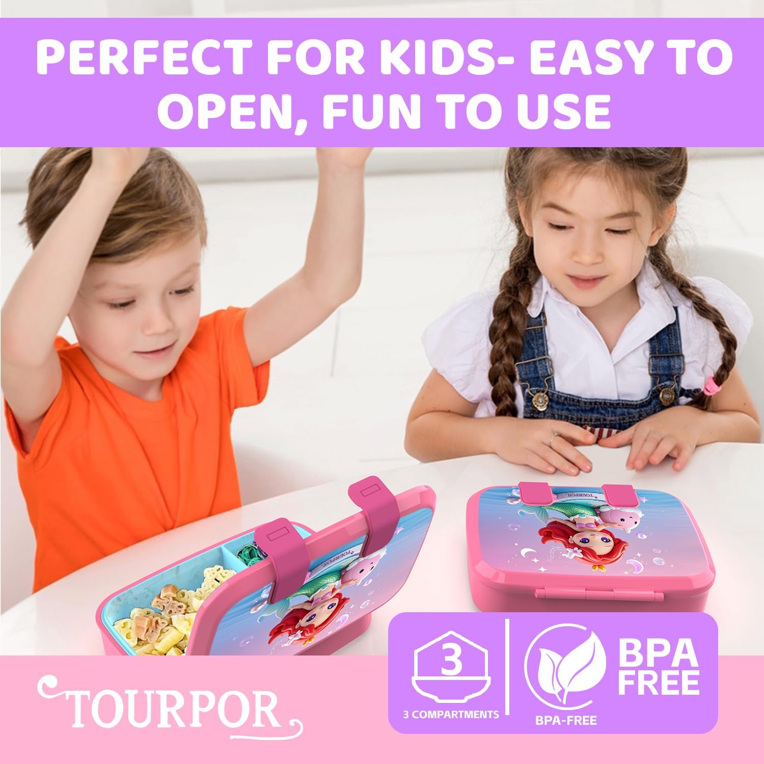 TOURPOR 3-Compartment Bento Box – Keep Meals Fresh, Fun & Mess-Free! Why Moms & Kids Love It? ✓ 100% Safe for Kids Lunch Box Made with BPA-Free, Phthalate-Free PP & silicone – no harmful chemicals, trusted for toddler lunch box for daycare and school meals. ✓ No More Leaky Lunches! Tight silicone latches keep sauces, dips, and yogurt securely in place – perfect for lunch containers for kids that survive backpacks! ✓ 3 Smart Compartments for Meal Prep Portion fruits, snacks, and main dishes in 800ml bento lunch box for kids – no flavor mixing! ✓ Grows with Your Child From preschool lunch box to teen girls' school meals, Suitable for ages 3 years and up.. Designed for Real Life: ● Microwave & Dishwasher Safe Food Container Reheat in 2 mins (120°C max), clean effortlessly – best bento box for busy moms! ● Lightweight & Durable Lunchbox for Travel Slim rectangle bento box (210x149x53mm, 349g) fits lunch bags, backpacks, or picnic baskets. ● Colors Kids Adore Blue lunch box for boys or pink lunch box for girls – both fade-resistant and unisex! Pro Tips for Parents: Freeze & Go for Daycare Prep toddler bento box meals weekly – thaw in minutes! Leakproof Sauce Hack Use the small compartment for hummus or ranch (even in lunch boxes for travel!). Dishwasher Safe & Easy Top-rack cleaning keeps your plastic-free lunch container like new. Our Promise to You: Eco-Friendly Lunch Box Alternative Each TOURPOR replaces 500+ plastic bags – love your family, love the planet. Perfect For: → School lunch boxes for girls/boys → Daycare lunch containers → Family picnic bento boxes → Office meal prep containers