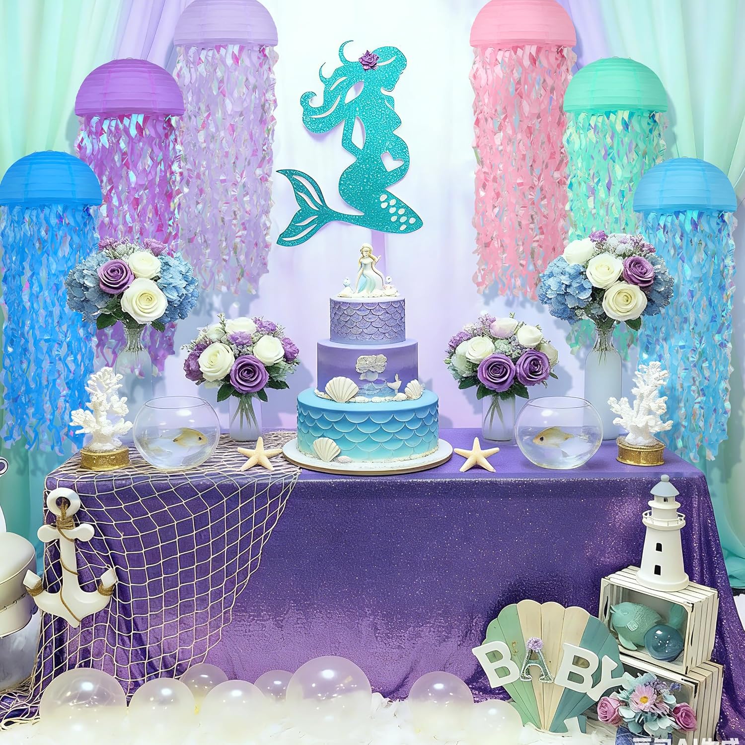 Our set contains 6 jellyfish lanterns in different colours (each 10 inch diameter), made of high-quality paper with sturdy steel wire support - lightweight, dimensionally stable and ideal for DIY customisation. With shiny silk stripes that shine in the light, they conjure up a magical underwater flair and attract every guest in their spell. The lanterns are assembled in a few steps, reusable and perfect for hanging at mermaid/underwater themed parties, weddings, birthdays, graduations as well as home decoration (bedroom, yard, hallway), exhibitions, shopping malls or art craft projects. The absolute eye-catcher for any maritime themed celebration