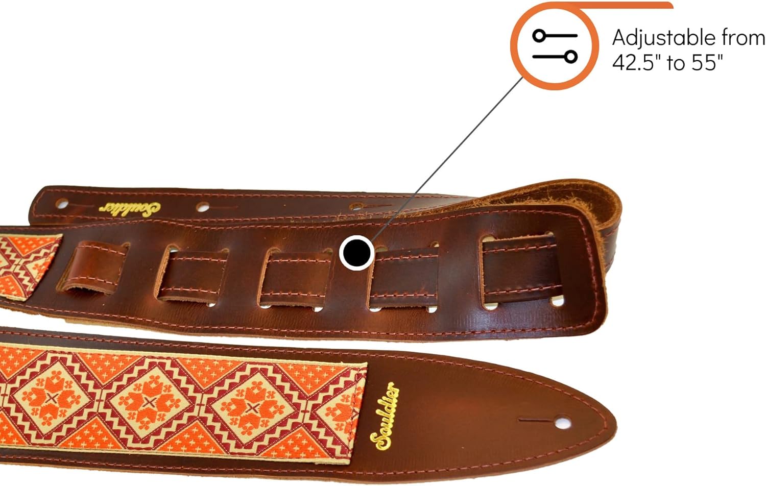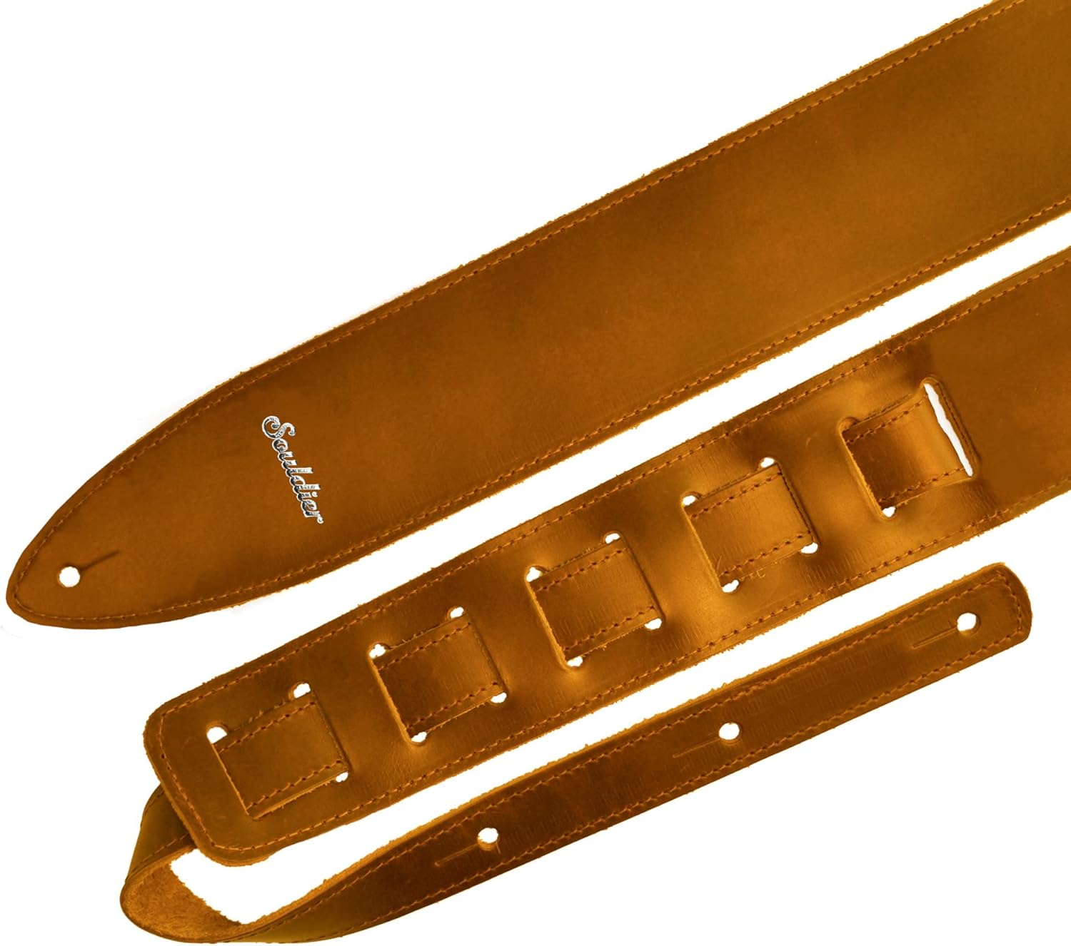 Torpedo Bass Straps are the latest model from Souldier Guitar Straps. These full-body leather straps mix our iconic, heavy-woven fabrics with a traditional leather strap in our trademark 'Torpedo' shape. Each strap has a silver or gold foil Souldier brand at the front of the strap and on the tail for a little extra-something. Souldier's Torpedo Bass Straps are 3.5" wide for a comfortable and sturdy wear. For comparison, our Torpedo Guitar Straps are 2.5" in width. Torpedo straps adjusts from 42.5" to 55" with a matching leather tail and have a reinforced stitch around body and tail.