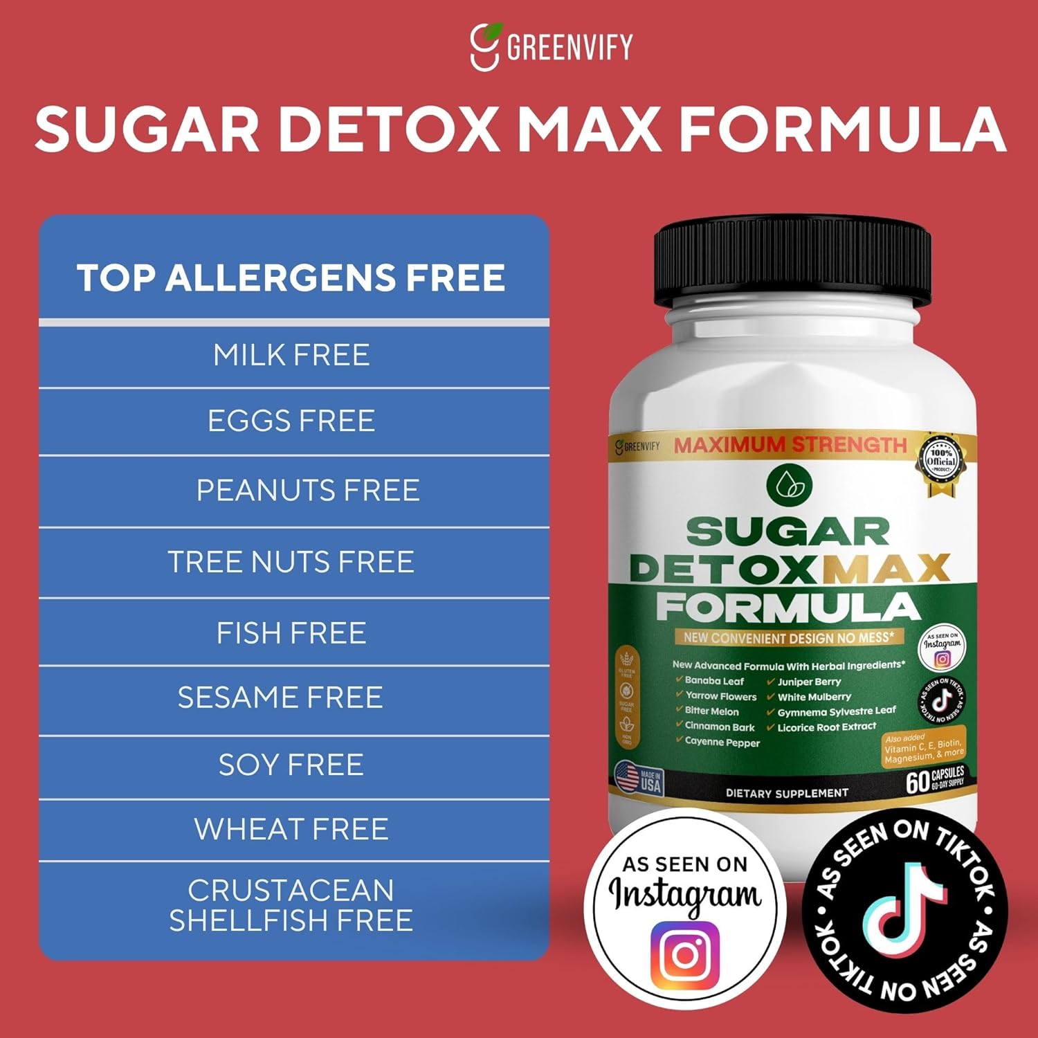 Support your wellness goals with Greenvify Sugar Detox Max Formula, a maximum-strength blend of vitamins and herbs carefully selected to help your body maintain healthy sugar balance and overall vitality. This advanced formula combines key nutrients and botanical extracts traditionally used to promote metabolic health, support energy levels, and aid in natural sugar management. Packed in easy-to-swallow capsules, it delivers daily nutritional support without unnecessary additives. Each bottle contains 60 capsules — a convenient 30-day supply — made with high-quality, non-GMO ingredients in a GMP-certified facility to ensure purity and potency.