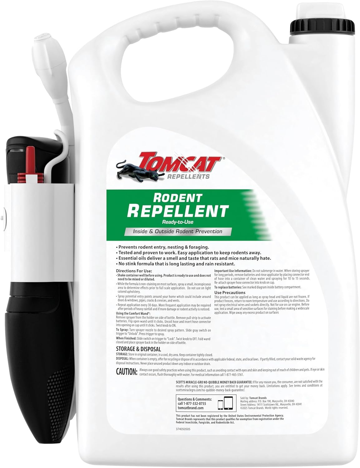 It is time to put a stop to unwanted visitors taking over your home. Tomcat® Repellents Rodent Repellent Ready-to-Use prevents mouse and rat entry, nesting, and foraging both indoors and out. It is formulated with an essential oil blend of cinnamon, garlic and peppermint oils that deliver a smell and taste rodents can't stand. Humans, on the other hand, go unbothered, as the spray is a no-stink formula. In addition, the product is safe for use around kids and pets (when used as directed). Tomcat® Repellents Rodent Repellent is rain-resistant and long-lasting with an application that should be repeated every 30 days. No matter where you apply, Tomcat will be ready to protect. We recommend spraying the entry points around your home, including around doors, windows, cracks and crevices, pipes, and vents. Test a small, inconspicuous area to determine effects prior to full scale application. Do not use on light-colored upholstery. This 1.33 gal. ready-to-use indoor and outdoor rodent repellent spray covers approximately 3,350 sq. ft. with an easy application via a battery operated Comfort Wand®.