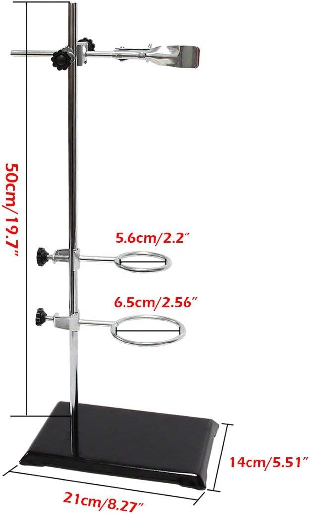 Specification: -Material: Stainless Steel -Weight: 6.6lbs, 3kg -Rod Length: 50cm/19.7" -Support Stand Size: 21x14cm/8.3"x5.5" -Diameter of 2 retort rings: 5.5cm/2.2" and 6.5cm/2.6" Package content: 1 x Support Stand 1 x Stainless Steel Rod 1 x Burette Clamp